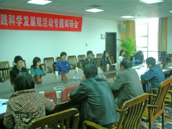 2009年4月3日,以“教风学风建设”为主题的深入学习实践科学发展观专题调研会在学院第三会议室举行。会议由学院学习实践科学发展观活动领导小组成员、副院长曾国安主持。座谈会分为两个阶段,第一阶段是教师座谈会,第二个阶段是学生座谈会。