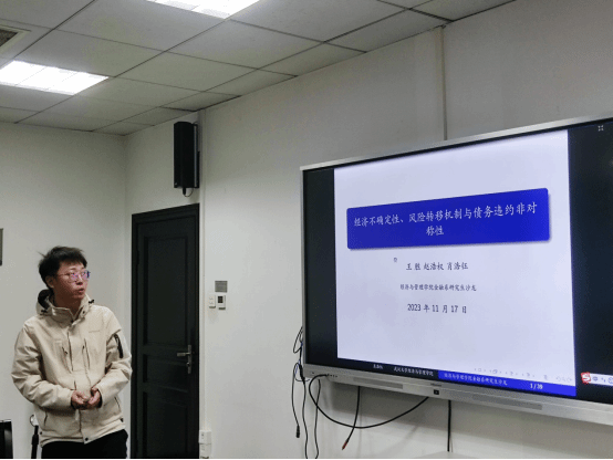 2022级金融学硕士生肖浩钰分享的报告题目是“经济不确定性、风险转移机制与债务违约非对称性”。该文章构建了具有内生风险转移机制的一般均衡模型,从银企间信息不对称的视角考察了企业在经济不确定性冲击下的债务违约非对称影响机制。从理论逻辑而言,企业对高风险投资项目的追求导致债务违约概率提高;此外,小企业存在更严重的信息不对称问题,在不确定性冲击下收到的负面影响加剧。8455新葡萄娱集团am金融系杨中超老师对这篇文章进行了点评。