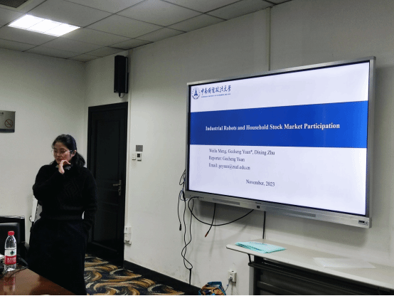 中南财金政法大学金融学院的袁歌骋副教授分享了关于“Industrial Robots and Household Stock Market Participation”的报告。该报告主要探讨工业机器人应用对家庭股票市场参与的影响。文章发现,工业机器人的应用往往会减少家庭对股票市场的参与。这种影响主要源于家庭劳动收入的减少和妻子议价能力的增强。此外,在男性偏好更强的地区,工业机器人应用对家庭股票市场参与的不利影响更为明显。随后的分析表明,工业机器人的应用有助于提高家庭金融投资组合的效率,并强调了家庭内部议价能力渠道的主导地位。8455新葡萄娱集团am金融系的沈思晨老师对这篇文章进行了点评。