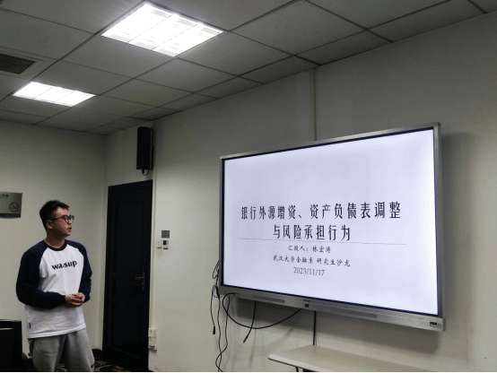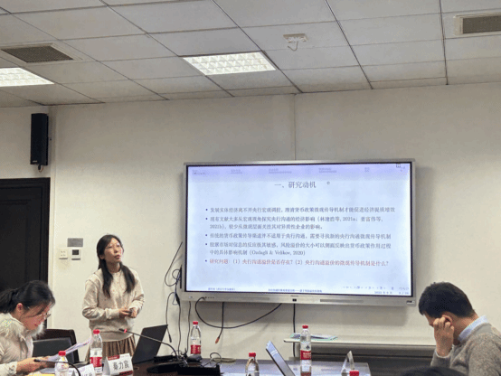 2022级金融学硕士生林宏涛做了题为“银行外源增资、资产负债表调整与风险承担行为”的报告。该文章通过固定效应模型来估计银行外源增资的即时效应,并进一步使用面板局部投影法来研究外源增资后银行资产负债表的动态调整。结论表明,首先,假设中的扩张模式可称为外源增资后的“理性扩张”;其次,调整过程具有一定实际意义;第三,金融、同业业务在扩张过程中充当流动性蓄水池功能。中国社会科学院世界经济与政治研究所的王碧珺老师对这篇文章进行了点评。